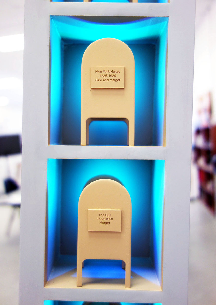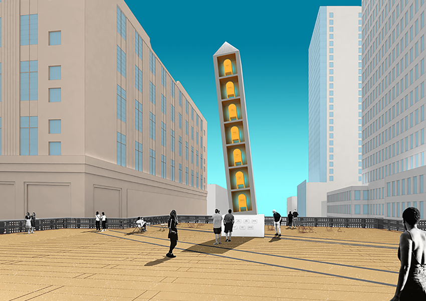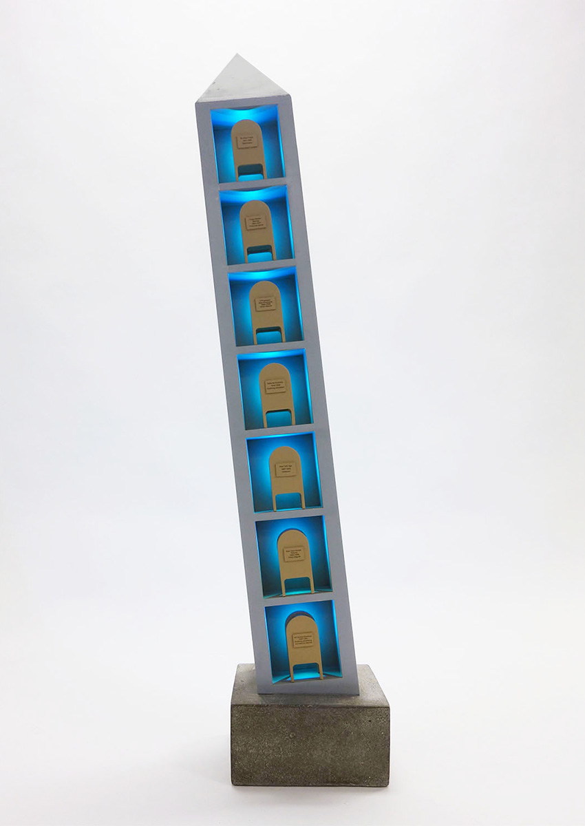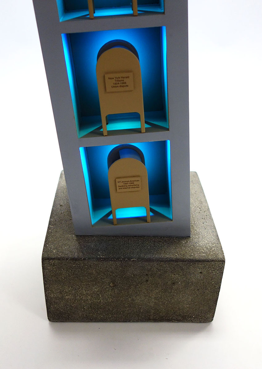 Our team fabricated and programmed exact 1/16 scale models for Charles Gaines and Sam Durant, two of the selected artists. Sam Durant’s proposal, “Untitled (drone)”, is a representation of the unmanned Predator drone. The proposed work acts as a wind vane, oscillating on its 20-foot column. The scale model moves subtly imitating the movement of the drone in the wind. A collaboration between Charles Gaines Studio and Peter Tolkin Architecture Gaines proposed the public artwork “Tilted Tower”. The work, lit by LED’s created a leaning tower that gave a critical and historical look at two major NY institutions, print media, and the postal service.