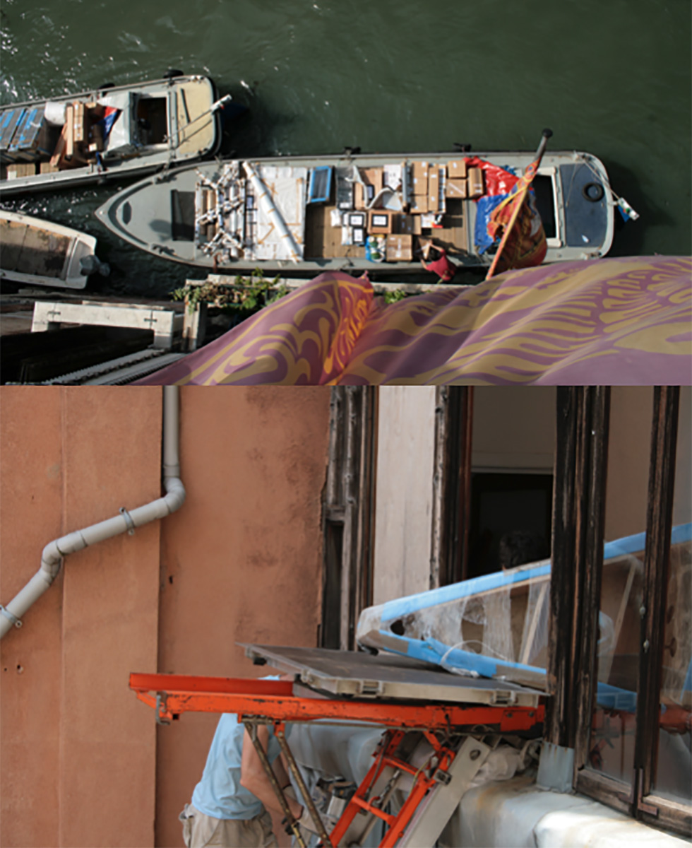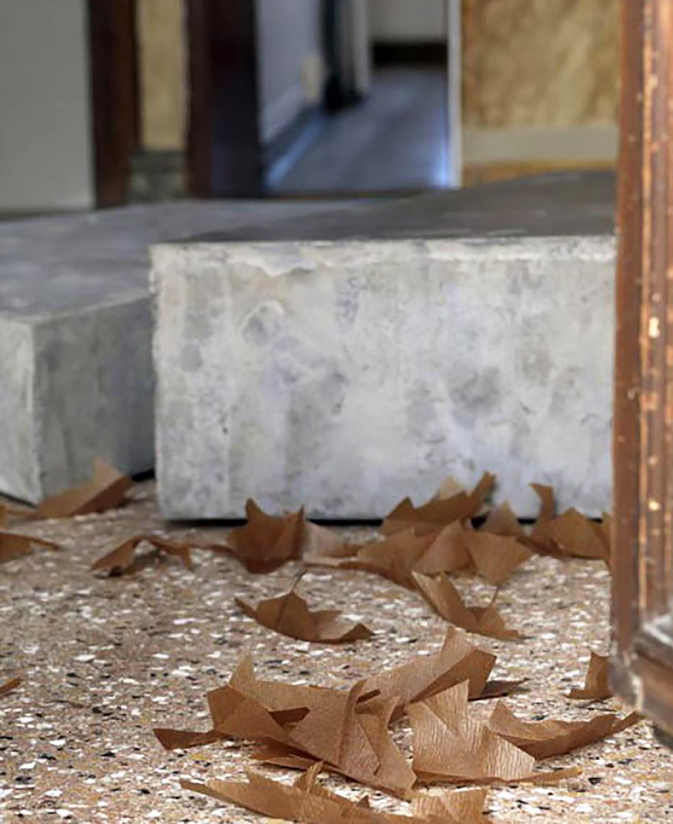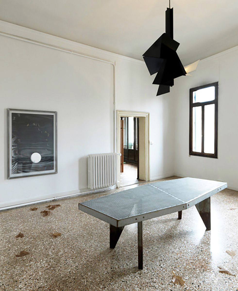 Martin Boyce’s lyrical installation of this commissioned work was installed in seven interconnected rooms in a 15th century Venetian Palazzo introducing into the fading grandeur of the palace groupings of works – suspended aluminum trees, scattered wax paper leaves, raised stepping stones, a wooden bird box, tables, and benches.  With narrow entrances, canals, and questions of load-bearing for the stepping stones and other works in the historical palazzo, logistics in fabrication method and installation were paramount to the successful execution of this monumental exhibition.