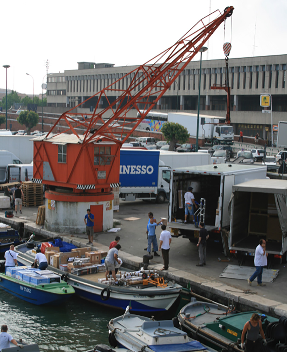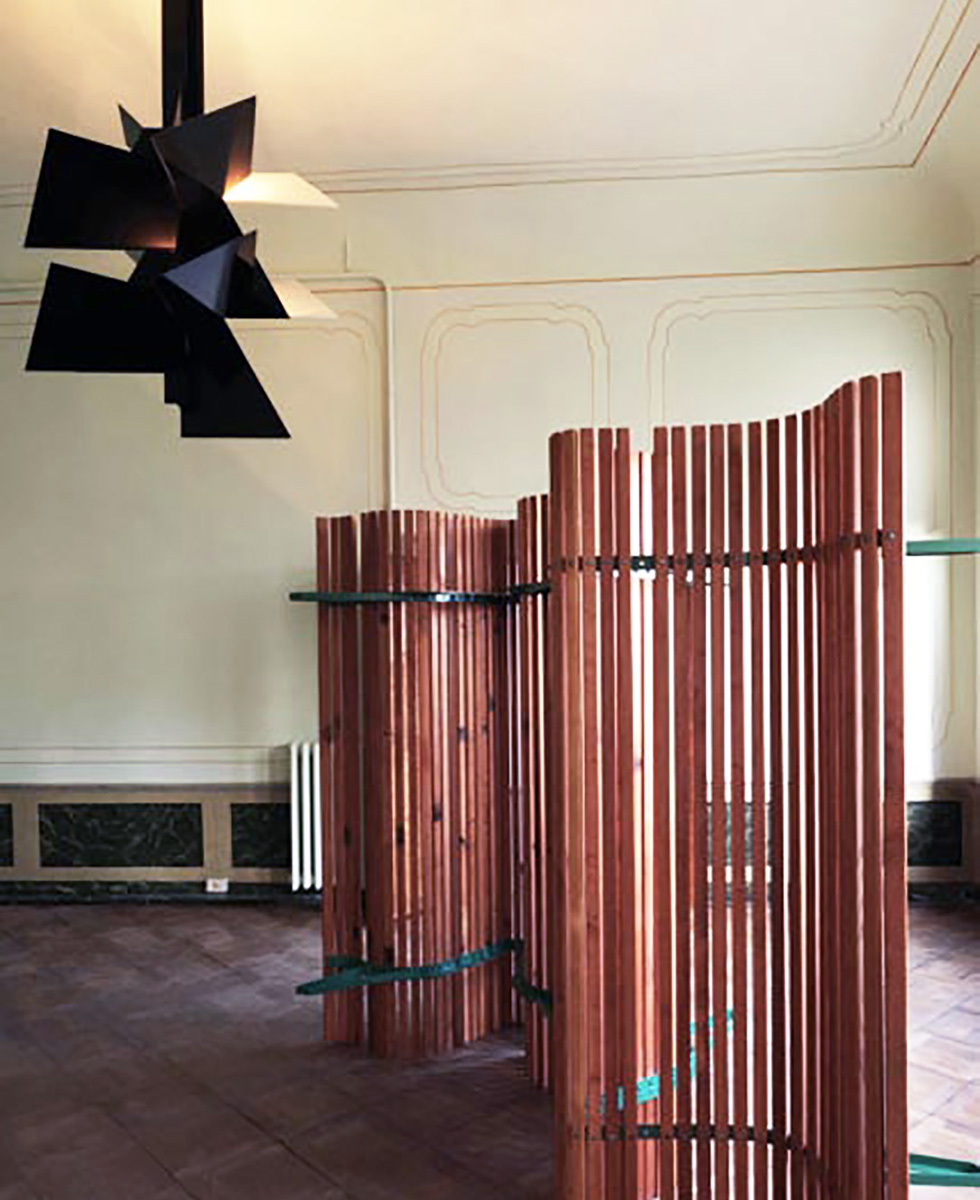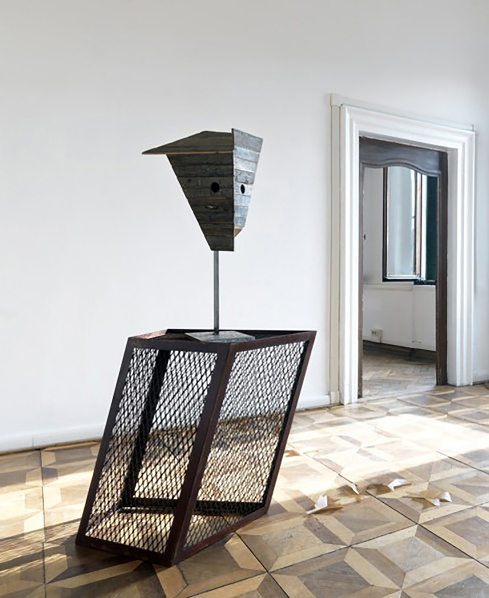 Martin Boyce’s lyrical installation of this commissioned work was installed in seven interconnected rooms in a 15th century Venetian Palazzo introducing into the fading grandeur of the palace groupings of works – suspended aluminum trees, scattered wax paper leaves, raised stepping stones, a wooden bird box, tables, and benches.  With narrow entrances, canals, and questions of load-bearing for the stepping stones and other works in the historical palazzo, logistics in fabrication method and installation were paramount to the successful execution of this monumental exhibition.